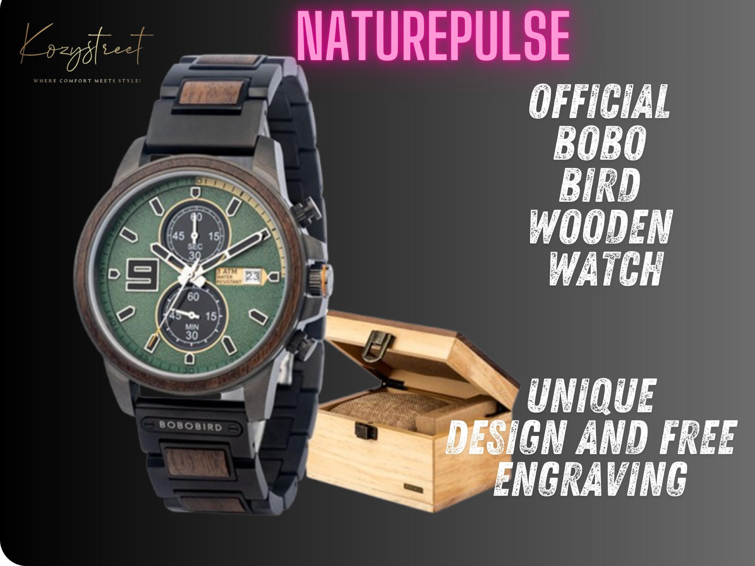 Elevate your style with the NaturePulse Chrono Series, a masterful blend of wood and stainless steel, designed for the modern man who values elegance, durability, and precision. Whether for business, casual, or fashion wear, this watch delivers unmatched sophistication and reliability.